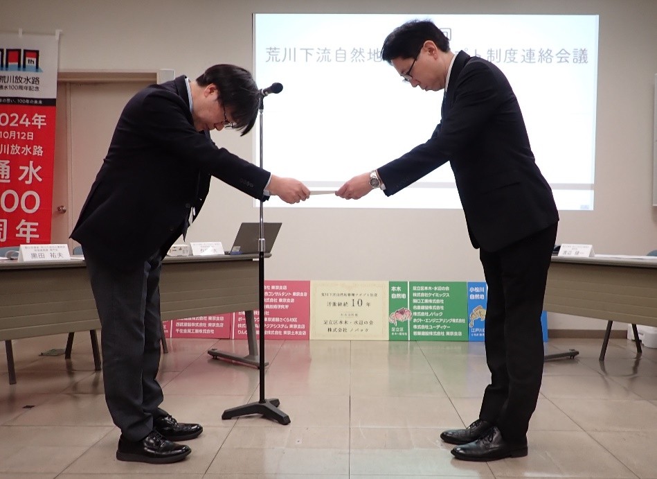 荒川下流河川事務所副所長 渡辺より、活動10周年を迎えた団体様へ感謝状を贈呈しました。また、令和6年度に活動いただいた団体様への感謝状の贈呈と、令和7年度に活動いただく団体様との合意書の取り交わしを行いました。